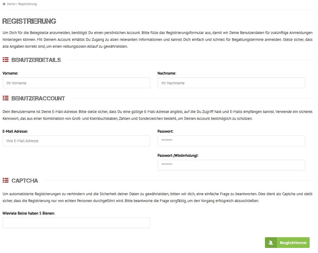 Bitte fülle das Registrierungsformular vollständig aus, damit Deine Benutzerdaten für zukünftige Anmeldungen hinterlegt werden können. Mit Deinem persönlichen Zugang kannst Du Dich jederzeit schnell und unkompliziert für Begattungstermine anmelden und Deine Daten eigenständig verwalten. Dein Benutzername ist Deine E-Mail-Adresse. Achte darauf, dass Du eine gültige E-Mail-Adresse verwendest, auf die Du jederzeit Zugriff hast und E-Mails empfangen kannst. Dies ist insbesondere wichtig für die Zustellung von Bestätigungs- und Informationsnachrichten im Rahmen der Belegstellenorganisation.