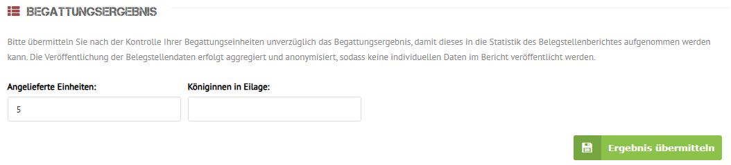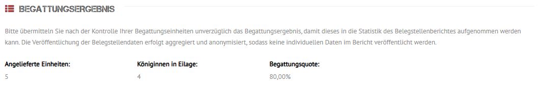 Bitte übermitteln Sie nach der Kontrolle Ihrer Begattungseinheiten unverzüglich das Begattungsergebnis, damit dieses in die Statistik des Belegstellenberichts aufgenommen werden kann.